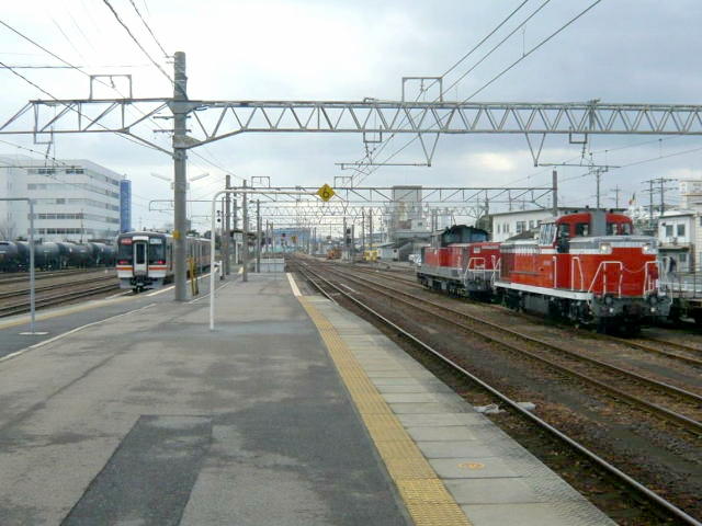 | もう一度四日市駅ホームから南四日市方面を撮影 DE10-1503が移動して伊勢鉄道の気動車が停車中 |
