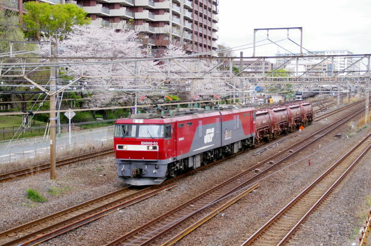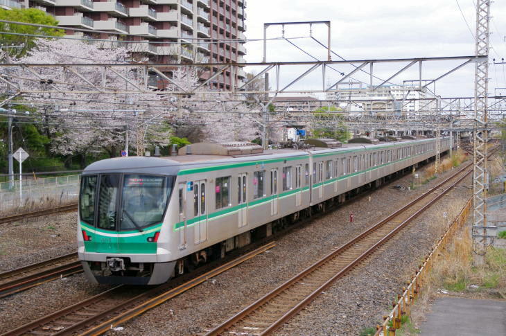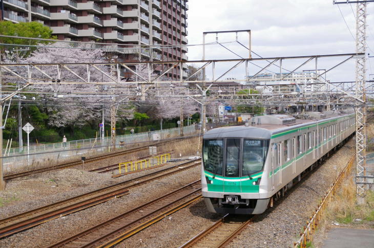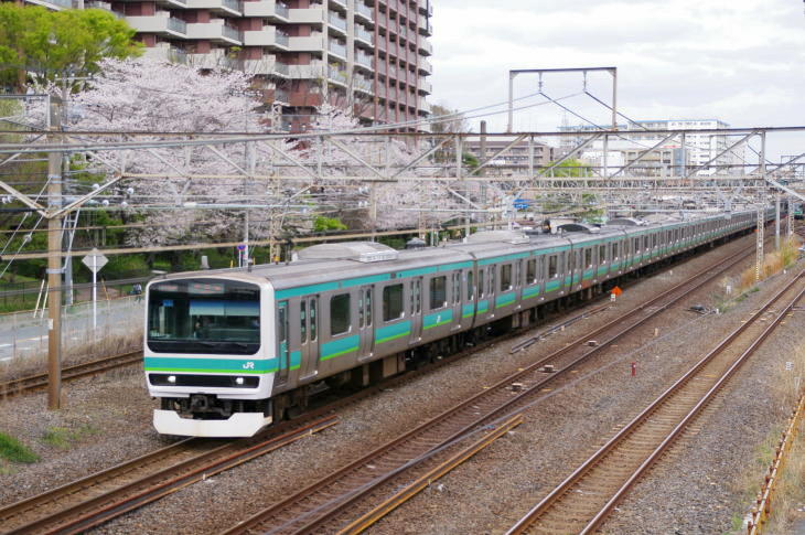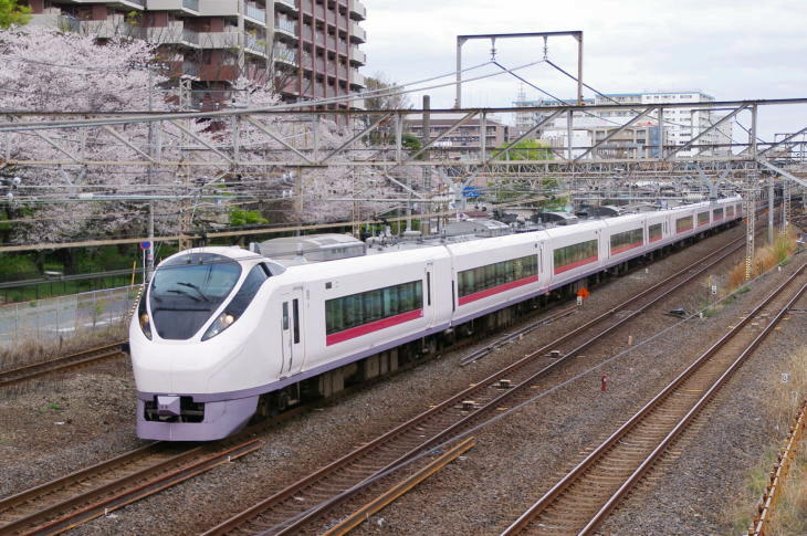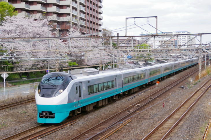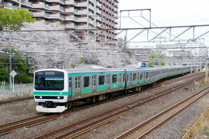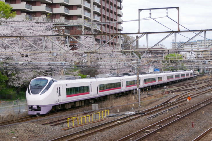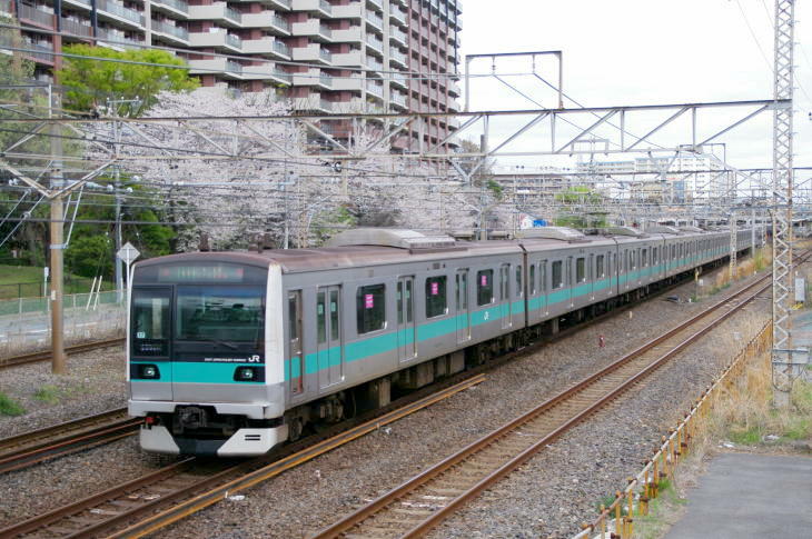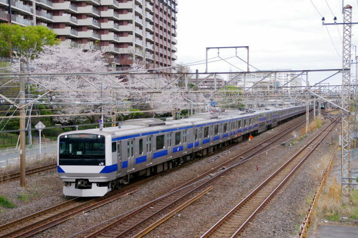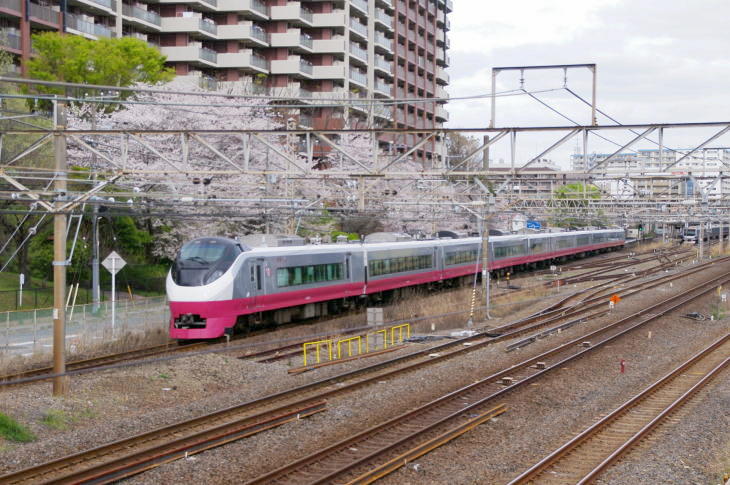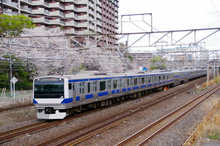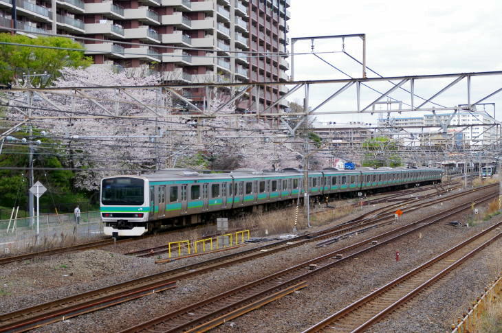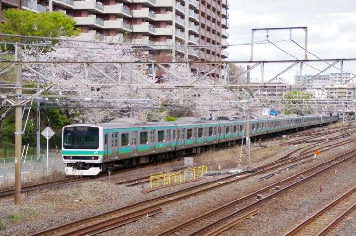 常磐線下り電車が我孫子駅に近づくと、左手に高層マンションが見えます。 ここは日立精機株式会社本社の跡地で、マンション建設後も多くの樹木が残されており、国道356号線沿いには桜が残っています。 令和6年4月11日に、桜をバックに撮影しました。 常磐線を走る車両は、小田急4000系を除き、一通り撮影できました。